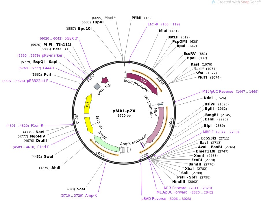 质粒名称:pMAL-p2X 质粒编号:75287 质粒备注: (Empty Backbone) Expresses proteins in the periplasm as fusions to maltose-binding protein 载体名称:pMAL-p2X 载体大小:6720 载体类型:原核表达 原核抗性:氨苄青霉素,100μg/mL 培养温度:37℃ 克隆菌株:DH5alpha 高拷贝/低拷贝:低拷贝 启动子:tac 克隆方法:限制性内切酶 5'测序引物:GGTCGTCAGACTGTCGATGAAGCC 3'测序引物:CGCCAGGGTTTTCCCAGTCACGAC 质粒图谱: