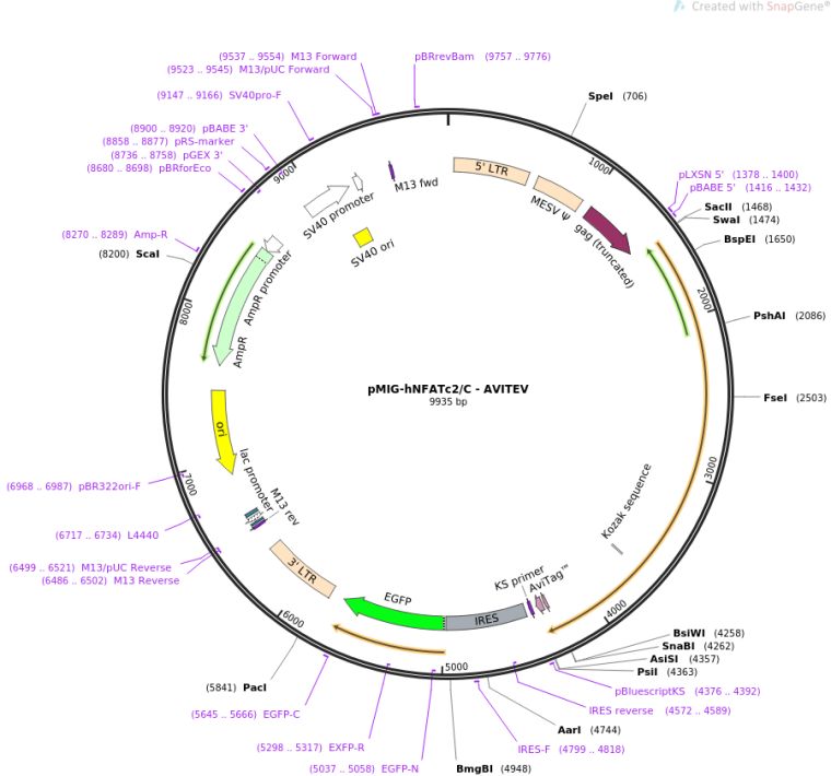 质粒名称:pMIG-hNFATc2/C - AVITEV 质粒编号:74058 质粒备注: retroviral expression plasmid for human NFATc2/C with C-terminal BirA-biotinylation signal and TEV celavage site 载体名称:pMSCV-IRES-GFP (pMIG) 载体大小:7200 完整质粒大小:9935 载体类型:哺乳动物表达,逆转录 筛选标记:GFP 原核抗性:氨苄青霉素,100μg/mL 培养温度:37℃ 克隆菌株:NEB Stable 高拷贝/低拷贝:未知 插入基因:human NFATc2, isoform C 基因别名:NFAT1 基因别名:nuclear factor of activated T-cells 2 物种来源:H. sapiens (human) 基因突变:silent mutation A1723C in the sequence of NM_173091.3 (A1503C position in ORF of the vector) 插入大小:2700 基因名称:NFATC2 (a.k.a. JCOSL, NFAT1, NFATP) 启动子:pMSCV-LTRs 克隆方法:限制性内切酶 5'克隆位点:SacII (not destroyed) 3'克隆位点:SnaB1, Sgf1 (not destroyed) 5'测序引物:CGTTCGACCCCGCCTCGATCC 3'测序引物:AGCTTGATATCGAATTCCG 质粒图谱:
