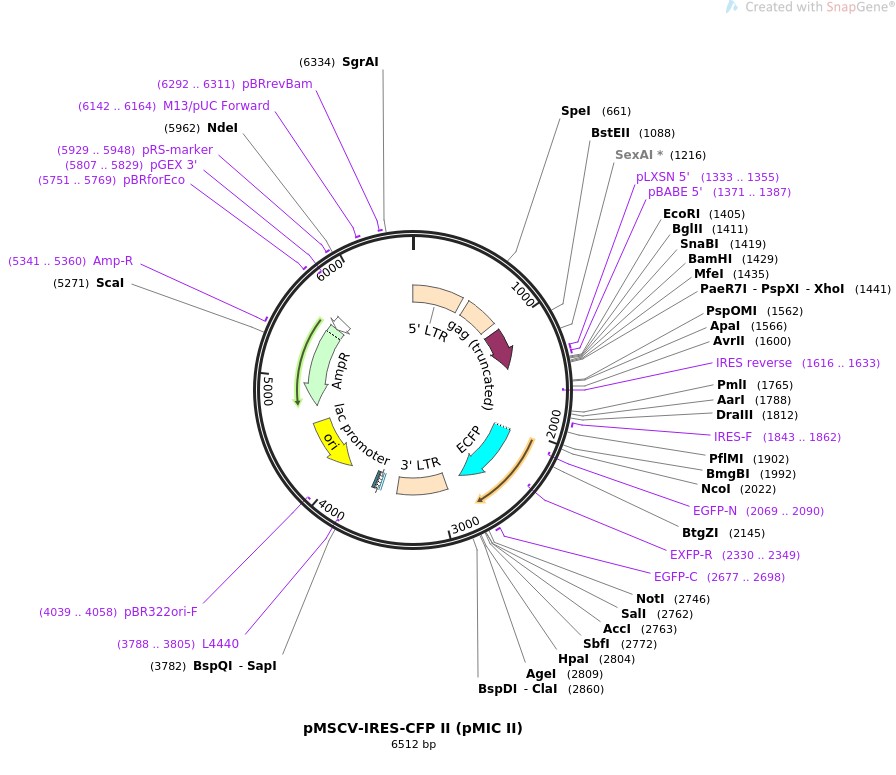 质粒名称:pMSCV-IRES-CFP II (pMIC II) 质粒编号:52109 质粒备注: (Empty Backbone) a bicistronic IRES-CFP containing retroviral vector, MCS is expanded from pMSCV-IRES-GFP 载体名称:MSCV IRES GFP 载体类型:哺乳动物表达,逆转录 原核抗性:氨苄青霉素,100μg/mL 培养温度:37℃ 克隆菌株:Stbl3 高拷贝/低拷贝:高拷贝 克隆方法:限制性内切酶 5'测序引物:pLXSN_5_primer 质粒图谱: