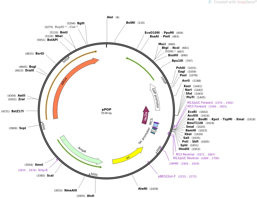 质粒名称:pPOP 质粒编号:59526 质粒备注: (Empty Backbone) Vector for pop-in/pop-out gene replacement in Pichia pastoris. 载体名称:pPOP 载体大小:5538 载体类型:酵母表达 筛选标记:ARG4 and T-urf13 原核抗性:氨苄青霉素,100μg/mL 培养温度:37℃ 克隆菌株:DH5alpha 高拷贝/低拷贝:未知 启动子:GAP 克隆方法:限制性内切酶 5'测序引物:M13pUC-fwd 3'测序引物:Lac_promoter 质粒图谱: