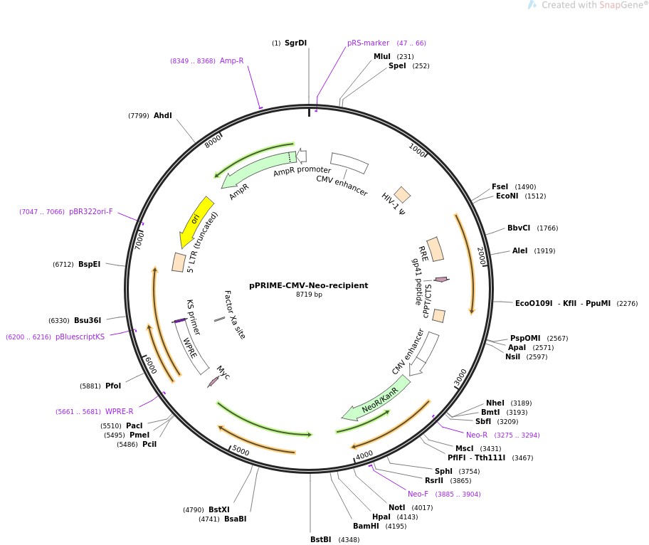质粒名称:pPRIME-CMV-Neo-recipient 质粒编号:11659 质粒备注: (Empty Backbone) 3rd generation lentiviral transfer vector. pPRIME-mating recipient plasmid with CMV promoter controlling Neomycin expression 载体名称:pPRIME-CMV-Neo-recipient 载体大小:8719 载体类型:哺乳动物表达,慢病毒 原核抗性:氨苄青霉素,100μg/mL 培养温度:37℃ 克隆菌株:DH5alpha 高拷贝/低拷贝:低拷贝 插入基因:None 克隆方法:限制性内切酶 5'测序引物:na 质粒图谱: