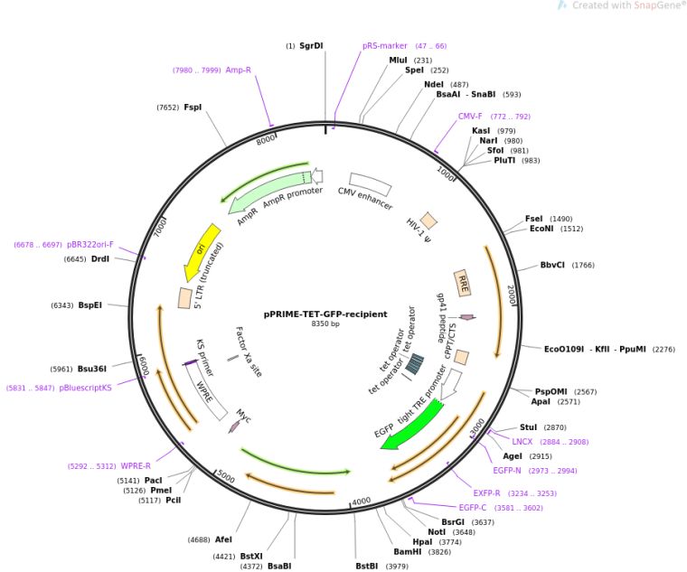 质粒名称:pPRIME-TET-GFP-recipient 质粒编号:11655 质粒备注: (Empty Backbone) 3rd generation lentiviral transfer vector. pPRIME-mating recipient plasmid with a tetracycline-responsive promoter (TET) controlling GFP expression 载体名称:pPRIME-TET-GFP-recipient 载体大小:8350 载体类型:哺乳动物表达,慢病毒 原核抗性:氨苄青霉素,100μg/mL 培养温度:37℃ 克隆菌株:DH5alpha 高拷贝/低拷贝:低拷贝 插入基因:None 克隆方法:限制性内切酶 5'测序引物:EGFP-C 质粒图谱: