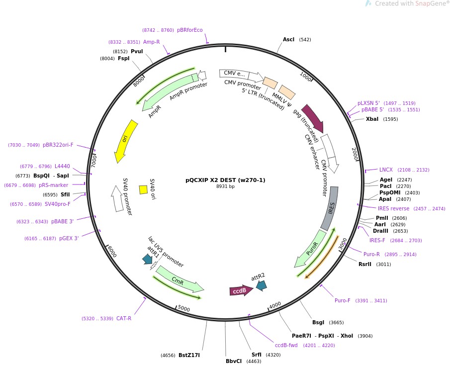 质粒名称:pQCXIP X2 DEST (w270-1) 质粒编号:17474 质粒备注: (Empty Backbone) Retroviral Gateway destination vector, RNAi, 3’LTR insertion, Puro 载体名称:pQCXIP 载体大小:8931 载体类型:Mammalian Expression, Retroviral, RNAi ; Destination vector 筛选标记:嘌呤霉素 原核抗性:Chloramphenicol and Ampicillin, 25 & 100 μg/mL 培养温度:37℃ 克隆菌株:ccdB Survival 高拷贝/低拷贝:高拷贝 插入基因:None 克隆方法:限制性内切酶 5'测序引物:n/a 质粒图谱: