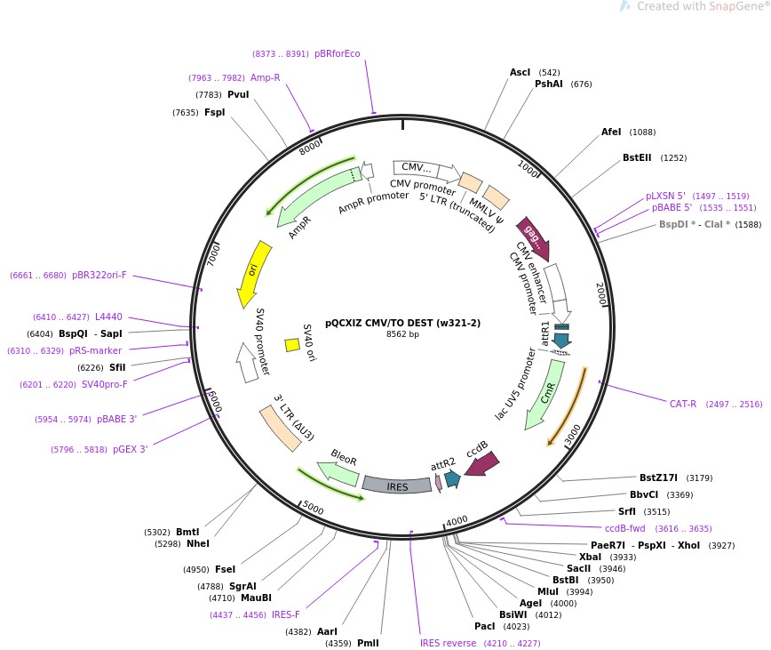 质粒名称:pQCXIZ CMV/TO DEST (w321-2) 质粒编号:17401 质粒备注: (Empty Backbone) Retroviral Gateway destination vector, Expression, CMV/TO promoter, Zeo 载体名称:pQCXIZ 载体大小:8562 载体类型:Mammalian Expression, Retroviral ; Destination vector 筛选标记:Zeocin 原核抗性:Chloramphenicol and Ampicillin, 25 & 100 μg/mL 培养温度:37℃ 克隆菌株:ccdB Survival 高拷贝/低拷贝:高拷贝 插入基因:None 克隆方法:限制性内切酶 5'测序引物:CMVforw 质粒图谱: