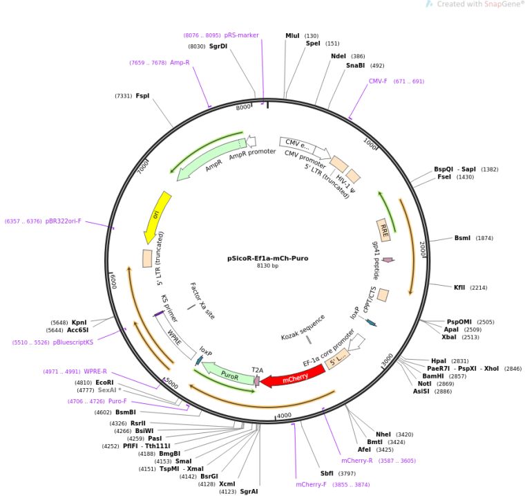 质粒名称:pSicoR-Ef1a-mCh-Puro 质粒编号:31845 质粒备注: (Empty Backbone) 载体名称:pSicoR-mCH 载体大小:8141 载体类型:Mammalian Expression, Lentiviral, RNAi, Cre/Lox 筛选标记:嘌呤霉素 原核抗性:氨苄青霉素,100μg/mL 培养温度:37℃ 克隆菌株:Stbl3 高拷贝/低拷贝:高拷贝 启动子:U6 for shRNA; Ef1alpha for mCherry-puromycin 质粒图谱:
