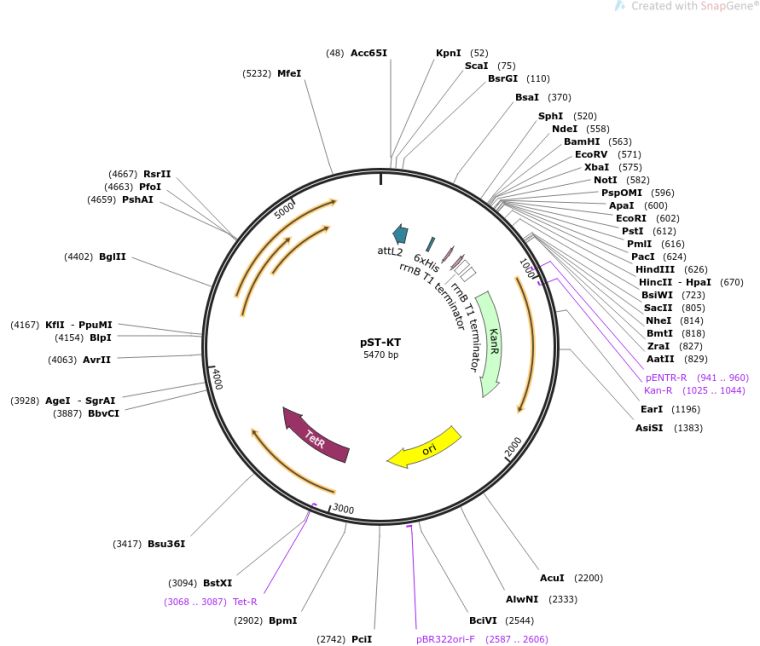 质粒名称:pST-KT 质粒编号:44561 质粒备注: (Empty Backbone) for ectopic inducible expression of mycobacterial proteins 载体名称:pVV16, pSE100, pMC1m 载体类型:Bacterial Expression ; E.coli-mycobacteria shuttle vector 原核抗性:卡那霉素,50μg/mL 培养温度:37℃ 克隆菌株:DH5alpha 高拷贝/低拷贝:高拷贝 启动子:UV15 promoter 标签/融合蛋白:· His tag (N terminal on backbone) · Flag tag (C terminal on backbone) 质粒图谱: