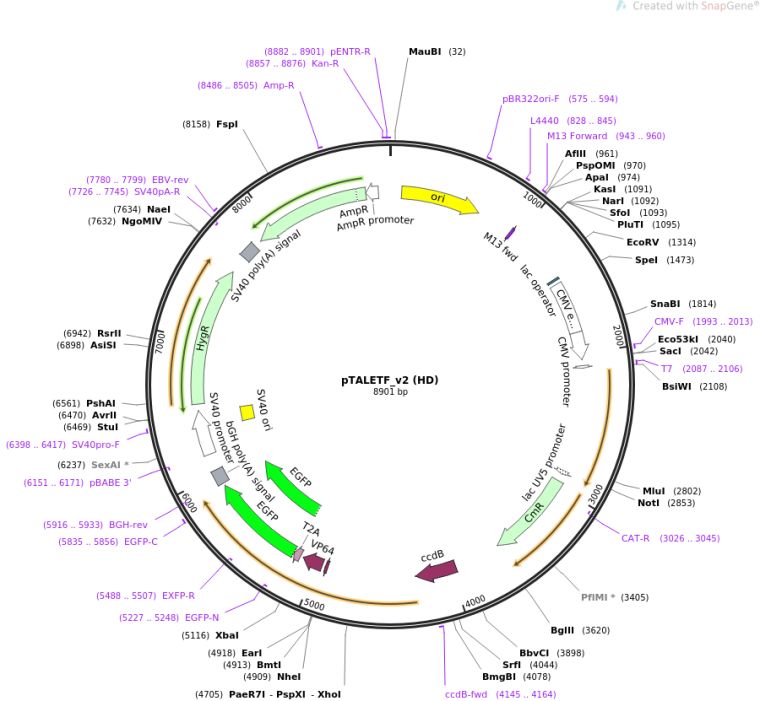 质粒名称:pTALETF_v2 (HD) 质粒编号:32188 载体名称:pCMV 载体类型:哺乳动物表达 原核抗性:Chloramphenicol and Ampicillin, 25 & 100 μg/mL 培养温度:37℃ 克隆菌株:ccdB Survival 高拷贝/低拷贝:高拷贝 插入基因:TALE Transcriptional Activator Backbone, HD for 0.5 repeat 质粒图谱: