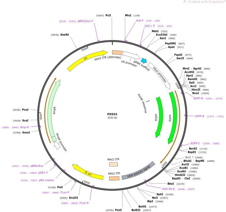 质粒名称:PX552 质粒编号:60958 质粒备注: pAAV-U6sgRNA(SapI)_hSyn-GFP-KASH-bGH (SpGuide acceptor). AAV plasmid for sgRNA cloning. GFP-KASH fusion facilitates FACS sorting of cells and nuclei. 载体名称:pAAV 载体大小:2905 完整质粒大小:5314 载体类型:Mammalian Expression, Mouse Targeting, AAV, CRISPR 原核抗性:氨苄青霉素,100μg/mL 培养温度:37℃ 克隆菌株:Stbl3 高拷贝/低拷贝:高拷贝 插入基因:U6_(SpaI)_sgRNA 物种来源:Synthetic 插入大小:351 启动子:U6 克隆方法:Gibson Cloning 5'测序引物:cgcgtgagggcctatttcc 3'测序引物:gcaagtgggttttaggaccag 质粒图谱: