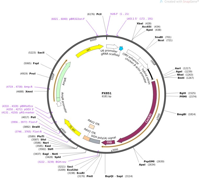 质粒名称:PX851 质粒编号:62883 质粒备注: N-term SpCas9 piece of inducible split-4 (Cas9(N)-FRB-NES split-4). 载体名称:PX330 载体大小:4222 完整质粒大小:6181 载体类型:哺乳动物表达,CRISPR 原核抗性:Ampicillin, 100 渭g/mL 培养温度:37掳C 克隆菌株:Stbl3 高拷贝/低拷贝:未知 插入基因:SpCas9 (aa 2-535) 插入大小:1959 启动子:CBh 标签/融合蛋白:· NES PTK2 (N terminal on insert) · FRB (C terminal on insert) 克隆方法:限制性内切酶 5'克隆位点:Age1 (not destroyed) 3'克隆位点:EcoR1 (not destroyed) 5'测序引物:ctggagcacctgcctgaaatcact锟? 3'测序引物:GGCTGATCAGCGAGCTCTAG锟? 质粒图谱: