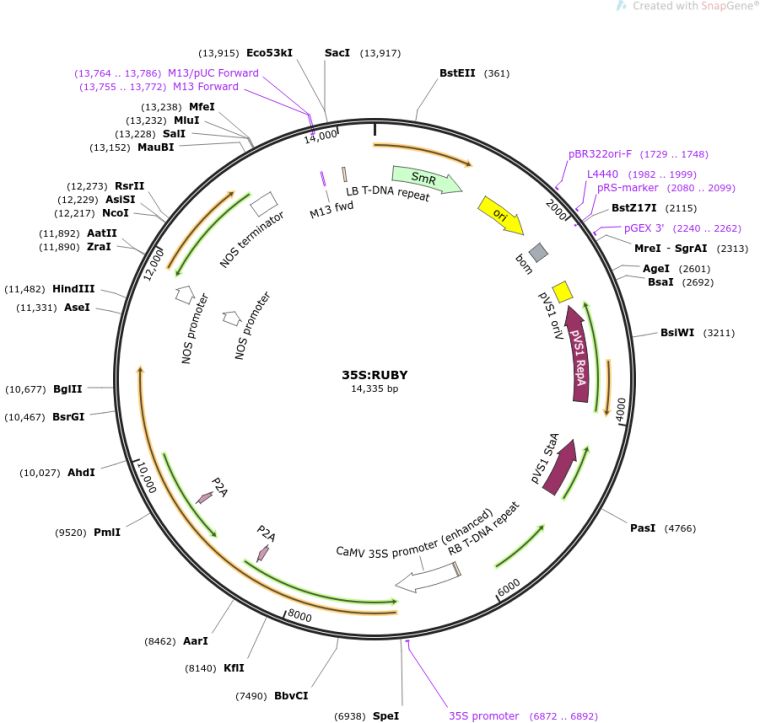 质粒名称:35S:RUBY 质粒编号:160908 质粒备注: RUBY under the control of CaMV 35S promoter/marker for transformation 载体名称:pHDE 载体大小:9346 完整质粒大小:14237 载体类型:Plant Expression 原核抗性:Spectinomycin, 50 μg/mL 培养温度:37℃ 克隆菌株:DH5alpha 高拷贝/低拷贝:未知 插入基因:RUBY and CaMV 35S promoter 物种来源:Synthetic; Califlower masaic virus 插入大小:4892 启动子:CaMV 35S 克隆方法:Gibson Cloning 5'测序引物:CCTGTCAAACACTGATAGTTTtgagacttttcaacaaagggt 3'测序引物:GCTTACTCAGTTAGGTCTAGCTTATCTTTAATCATATTCCATAGTCCA 质粒图谱: