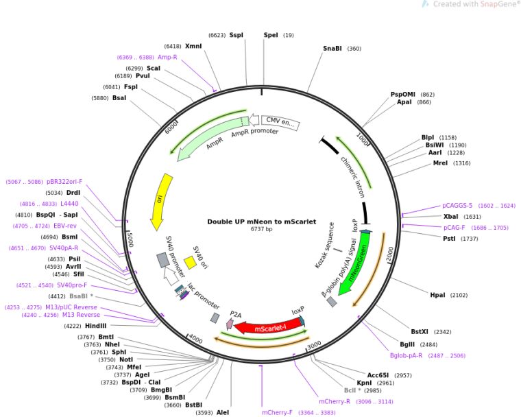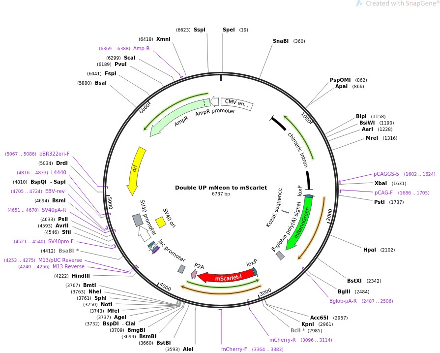 质粒名称:Double UP mNeon to mScarlet 质粒编号:125134 质粒备注: (Empty Backbone) Natively produces mNeon, in the presence of Cre will be recombined to produce mScarlet. 载体名称:pCAX 载体大小:6734 载体类型:哺乳动物表达 原核抗性:氨苄青霉素,100μg/mL 培养温度:37℃ 克隆菌株:DH5alpha 高拷贝/低拷贝:高拷贝 插入基因:None 基因突变:Removed Not1 site in mScarlet 质粒图谱: