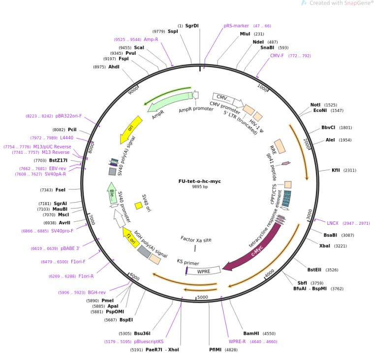 质粒名称:FU-tet-o-hc-myc 质粒编号:19775 载体名称:FUdeltaGW 载体大小:8400 载体类型:哺乳动物表达,慢病毒 原核抗性:氨苄青霉素,100μg/mL 培养温度:37℃ 克隆菌株:Stbl3 高拷贝/低拷贝:高拷贝 插入基因:c-myc 物种来源:H. sapiens (human) 基因突变:T58A 插入大小:1320 基因名称:MYC (a.k.a. MRTL, MYCC, bHLHe39, c-Myc) 克隆方法:限制性内切酶 5'克隆位点:EcoRI (destroyed during cloning) 3'克隆位点:EcoRI (destroyed during cloning) 5'测序引物:LNCX 3'测序引物:WPRE-R 质粒图谱:
