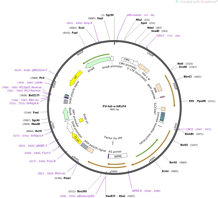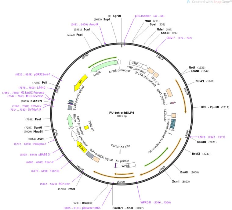 质粒名称:FU-tet-o-hKLF4 质粒编号:19777 载体名称:FUdeltaGW 载体大小:8400 载体类型:哺乳动物表达,慢病毒 原核抗性:氨苄青霉素,100μg/mL 培养温度:37℃ 克隆菌株:Stbl3 高拷贝/低拷贝:高拷贝 插入基因:Klf4 物种来源:H. sapiens (human) 插入大小:1425 基因名称:KLF4 (a.k.a. EZF, GKLF) 克隆方法:限制性内切酶 5'克隆位点:EcoRI (unknown if destroyed) 3'克隆位点:EcoRI (unknown if destroyed) 5'测序引物:CMV-F 质粒图谱: