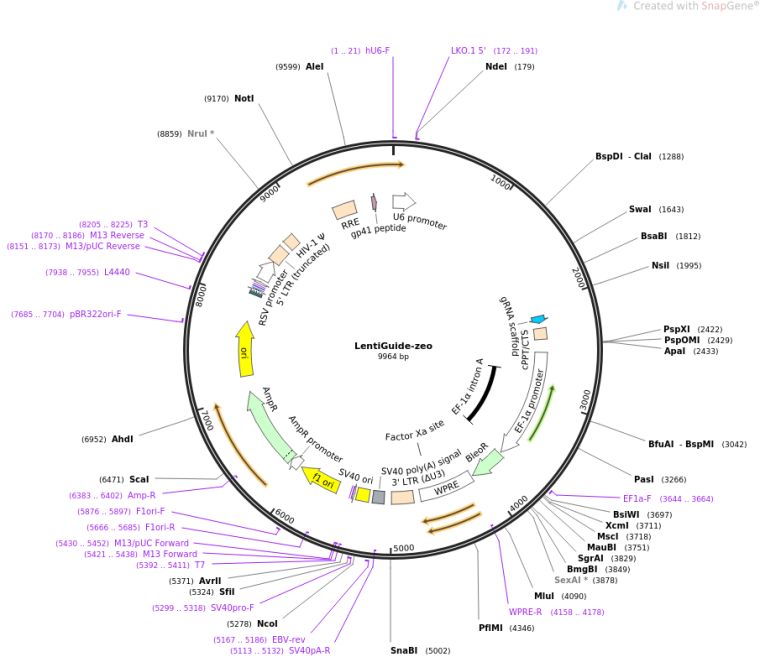 质粒名称:LentiGuide-zeo 质粒编号:160091 质粒备注: (Empty Backbone) Expresses S. pyogenes CRISPR chimeric RNA element with customizable sgRNA from U6 promoter and zeocin resistance marker 载体名称:LentiGuide backbone 载体类型:哺乳动物表达,慢病毒,CRISPR 筛选标记:Zeocin 原核抗性:氨苄青霉素,100μg/mL 培养温度:37℃ 克隆菌株:NEB Stable 高拷贝/低拷贝:高拷贝 插入基因:None 质粒图谱: