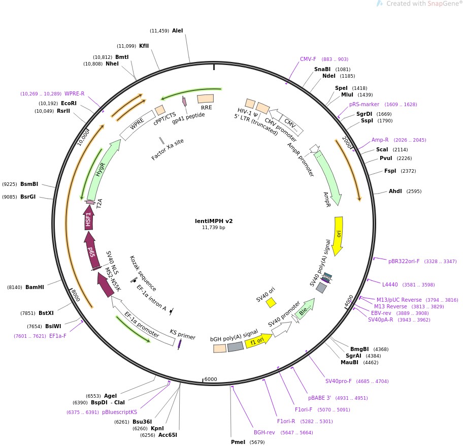 质粒名称:lentiMPH v2 质粒编号:89308 质粒备注: lenti vector encoding the MS2-P65-HSF1 activator helper complex with a 2A Hygro resistance marker (EF1a-MS2-p65-HSF1-2A-Hygro-WPRE). This version has a higher virus titer. 载体名称:plenti 载体类型:哺乳动物表达,慢病毒 筛选标记:潮霉素 原核抗性:氨苄青霉素,100μg/mL 培养温度:37℃ 克隆菌株:Stbl3 高拷贝/低拷贝:高拷贝 插入基因:MS2-P65-HSF1_2A_Hygro 物种来源:H. sapiens (human), Synthetic 基因突变:N55K in MS2 插入大小:2526 基因名称:RELA (a.k.a. AIF3BL3, CMCU, NFKB3, p65) 启动子:EF1a 克隆方法:限制性内切酶 5'克隆位点:EcoRI (not destroyed) 3'克隆位点:BsiWI (not destroyed) 5'测序引物:cacatagcgtaaaaggagcaacatag 3'测序引物:GTTTGGATCTTGGTTCATTCTCAAGCCTCAG 质粒图谱:
