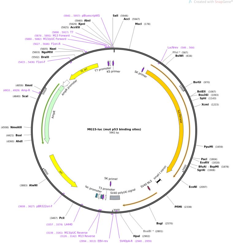 质粒名称:MG15-luc (mut p53 binding sites) 质粒编号:16443 载体名称:n/a 载体类型:Mammalian Expression, Luciferase 原核抗性:氨苄青霉素,100μg/mL 培养温度:37℃ 克隆菌株:DH5alpha 高拷贝/低拷贝:未知 插入基因:p53-binding site (mutant) 基因名称:TP53 (a.k.a. BCC7, BMFS5, LFS1, P53, TRP53) 克隆方法:限制性内切酶 5'克隆位点:EcoRV (destroyed during cloning) 3'克隆位点:EcoRV (destroyed during cloning) 5'测序引物:M13pUC-Fwd 3'测序引物:LucNRev 质粒图谱: