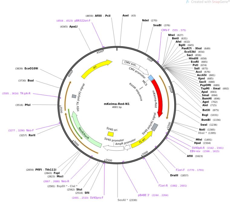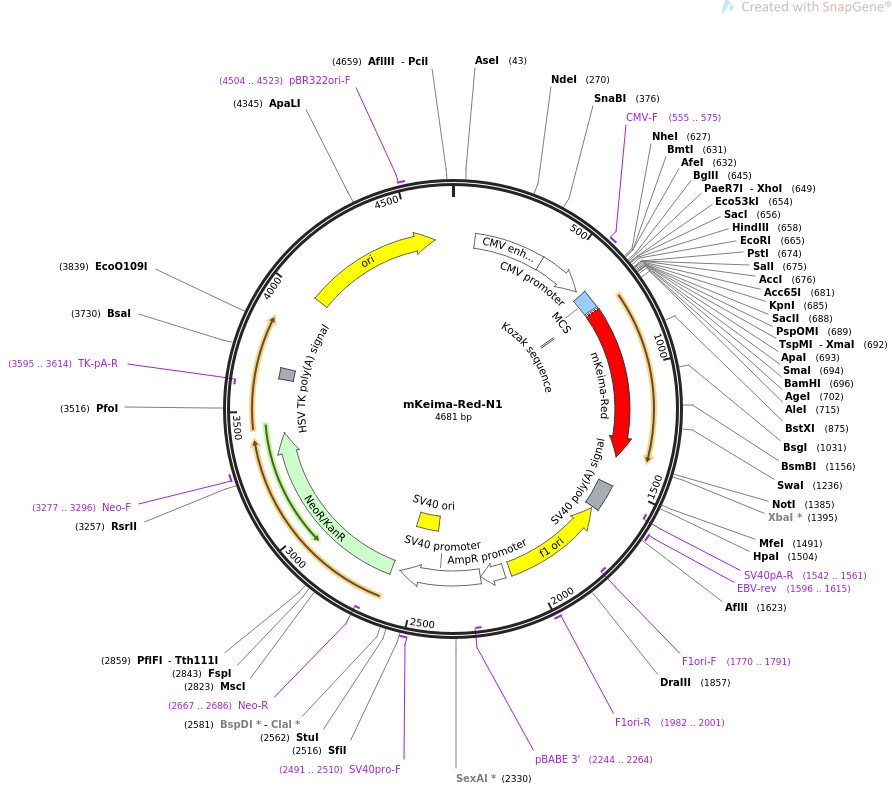质粒名称:mKeima-Red-N1 质粒编号:54597 质粒备注: (Empty Backbone) Localization: N1 Cloning Vector, Excitation: 440, Emission: 620 载体名称:mKeima-Red-N1 载体大小:4750 载体类型:哺乳动物表达 筛选标记:新霉素(G418) 原核抗性:卡那霉素,50μg/mL 培养温度:37℃ 克隆菌株:DH5alpha 高拷贝/低拷贝:高拷贝 插入基因:None 质粒图谱: