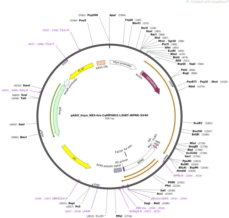 质粒名称:pAAV_hsyn_NES-his-CaMPARI2-L398T-WPRE-SV40 质粒编号:101064 质粒备注: AAV vector expressing CaMPARI2_L398T (Kd = 825nM), a photoconvertible fluorescent protein-based calcium integrator, in neurons 载体名称:pAAV 载体大小:4267 完整质粒大小:5716 载体类型:AAV 原核抗性:氨苄青霉素,100μg/mL 培养温度:37℃ 克隆菌株:NEB Stable 高拷贝/低拷贝:高拷贝 插入基因:CaMPARI2_L398T 物种来源:Synthetic 插入大小:1446 启动子:hsyn (synapsin-1) 标签/融合蛋白:· NES_his (N terminal on insert) · FLAG-HA-myc (C terminal on insert) 克隆方法:Gibson Cloning 5'测序引物:f.hsyn 3'测序引物:r.WPRE 质粒图谱: