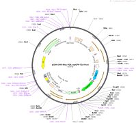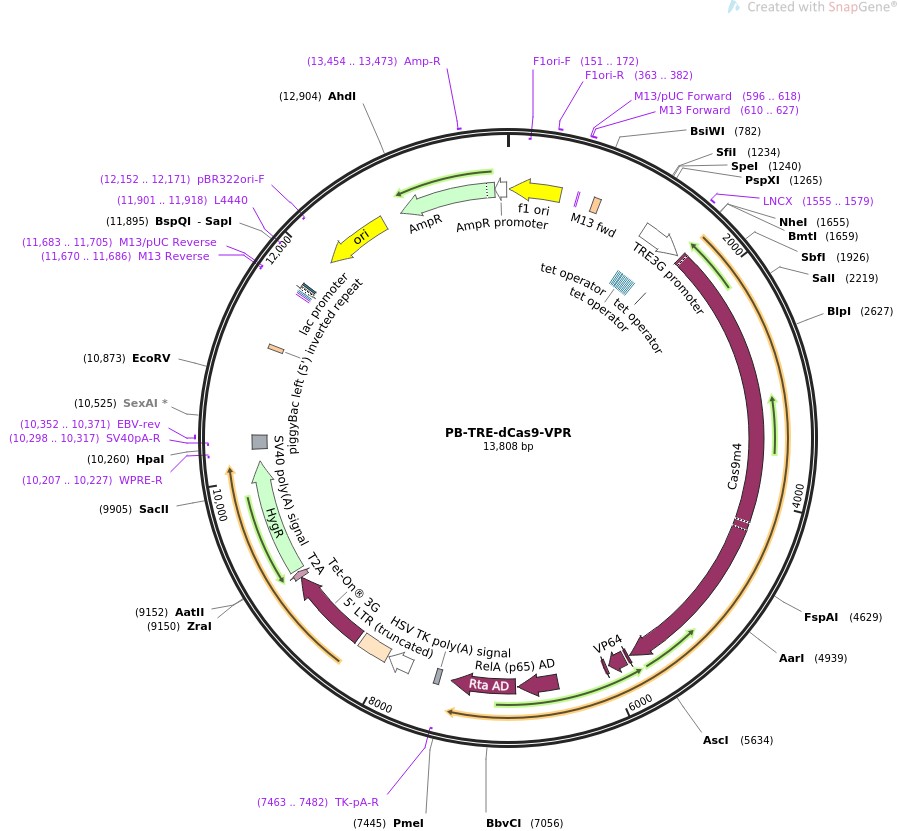 质粒名称:PB-TRE-dCas9-VPR 质粒编号:63800 质粒备注: SP-dCas9-VPR with doxycycline-inducible expression 载体名称:PB-TRE 载体类型:Mammalian Expression, CRISPR, Synthetic Biology ; Piggybac 筛选标记:潮霉素 原核抗性:氨苄青霉素,100μg/mL 培养温度:37℃ 克隆菌株:DH10B 高拷贝/低拷贝:高拷贝 插入基因:dCas9-VPR 基因别名:VP64-p65-Rta 物种来源:H. sapiens (human), M. musculus (mouse) 插入大小:5733 启动子:TRE 克隆方法:Gibson Cloning 5'测序引物:GATTCCCCAGAAGGAAGAGG 质粒图谱: