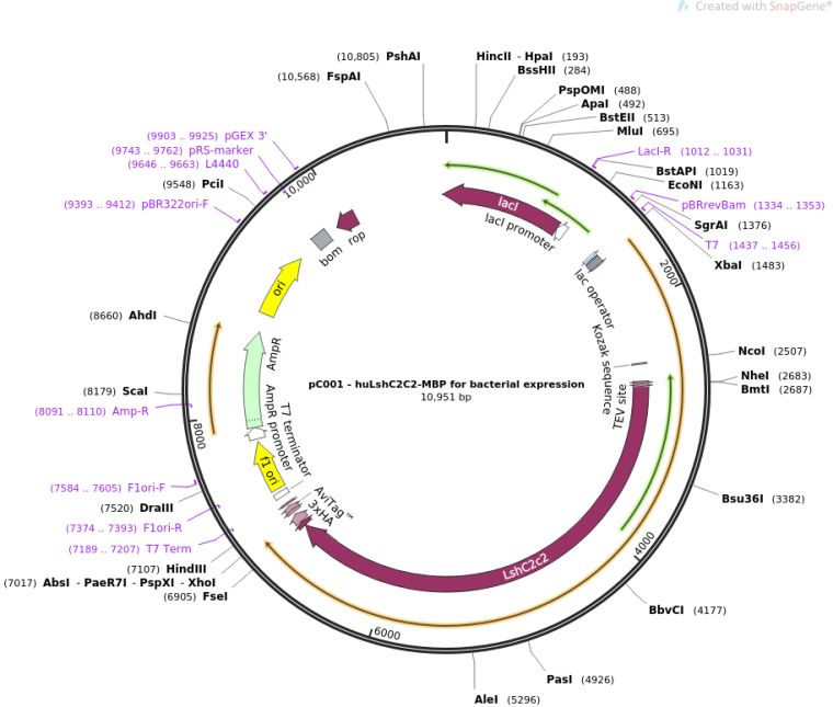 质粒名称:pC001 - huLshC2C2-MBP for bacterial expression 质粒编号:79150 质粒备注: Expresses human codon-optimized LshC2c2 for purification in E. coli 载体名称:BPV00356 pET21GG2-His(6)-MBP_Flag-Avi 载体大小:6650 完整质粒大小:10955 载体类型:原核表达 原核抗性:氨苄青霉素,100μg/mL 培养温度:37℃ 克隆菌株:DH5alpha 高拷贝/低拷贝:低拷贝 插入基因:C2c2 基因别名:Cas13a 物种来源:Leptotrichia shahii 插入大小:4305 启动子:T7 克隆方法:限制性内切酶 5'克隆位点:BsaI (unknown if destroyed) 3'克隆位点:BsaI (unknown if destroyed) 5'测序引物:atggggaacctgttcggacaca 质粒图谱: