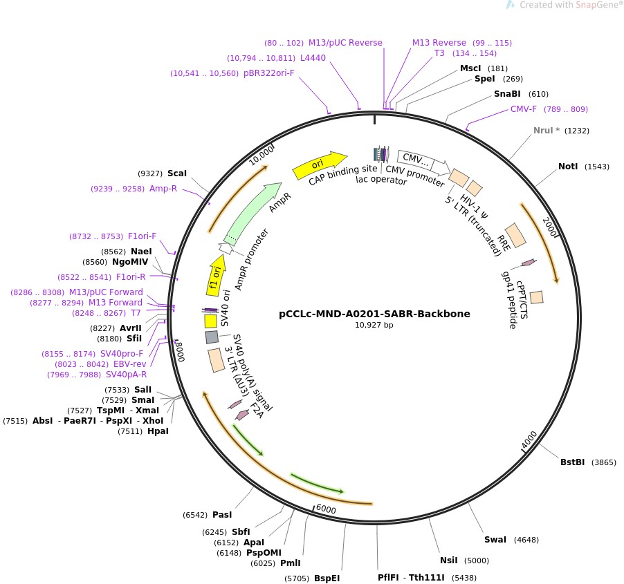质粒名称:pCCLc-MND-A0201-SABR-Backbone 质粒编号:119050 质粒备注: (Empty Backbone) 3rd gen transfer vector. HLA-A0201 linked to b2-microglobulin and CD28-CD3z signaling domain. Contains a stuffer fragment flanked by BsmBI sites at the epitope cloning site. 载体名称:pCCLc-MND 载体大小:6600 载体类型:哺乳动物表达,慢病毒 筛选标记:surface myc-tag 原核抗性:氨苄青霉素,100μg/mL 培养温度:37℃ 克隆菌株:NEB Stable 高拷贝/低拷贝:高拷贝 启动子:MND 克隆方法:未知 5'测序引物:GCTCCCCGAGCTCAATAAAAG 3'测序引物:TGGCTAAGATCTACAGCTGCCTT 质粒图谱: