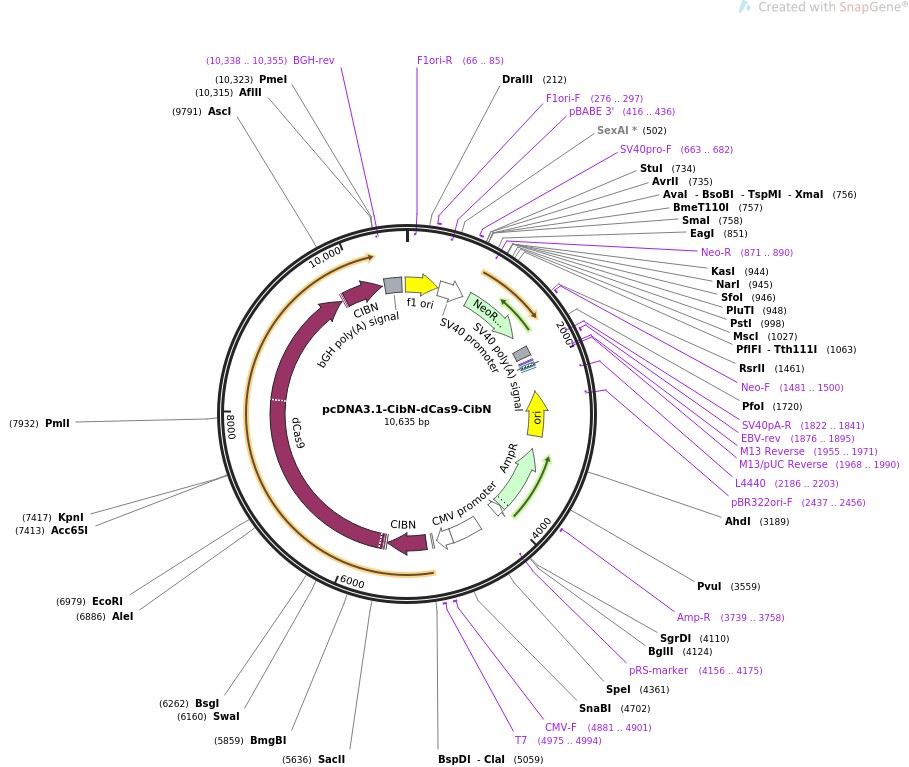 质粒名称:pcDNA3.1-CibN-dCas9-CibN 质粒编号:60553 质粒备注: Expresses CibN-dCas9-CibN in mammalian cells 载体名称:pcDNA3.1 载体大小:5333 完整质粒大小:10632 载体类型:哺乳动物表达,CRISPR 筛选标记:新霉素(G418) 原核抗性:氨苄青霉素,100μg/mL 培养温度:37℃ 克隆菌株:Stbl3 高拷贝/低拷贝:高拷贝 插入基因:dCas9-CibN 物种来源:A. thaliana (mustard weed); S. pyogenes 基因突变:inactivating Cas9 mutations D10A and H840A 插入大小:5298 启动子:CMV 标签/融合蛋白:· FLAG (N terminal on insert) · SV40 NLS (N terminal on insert) · SV40 NLS (C terminal on insert) 克隆方法:Gibson Cloning 5'测序引物:ATTGACGCAAATGGGCGGTAGGCGTGT 3'测序引物:GCC TGC TAT TGT CTT CCC AAT 质粒图谱: