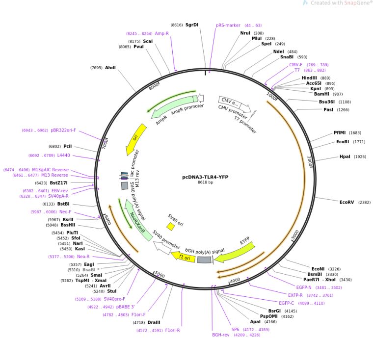 质粒名称:pcDNA3-TLR4-YFP 质粒编号:13018 载体名称:pcDNA3-YFP 载体大小:6100 载体类型:哺乳动物表达 筛选标记:新霉素(G418) 原核抗性:氨苄青霉素,100μg/mL 培养温度:37℃ 克隆菌株:DH5alpha 高拷贝/低拷贝:高拷贝 插入基因:Toll-Like Receptor 4 基因别名:TLR4 基因别名:TOLL 基因别名:CD284 物种来源:H. sapiens (human) 插入大小:2517 基因名称:TLR4 (a.k.a. ARMD10, CD284, TLR-4, TOLL) 克隆方法:限制性内切酶 5'克隆位点:BamHI (not destroyed) 3'克隆位点:XhoI (not destroyed) 5'测序引物:T7 3'测序引物:GTCTTGTAGTTGCCGTCGTC 质粒图谱: