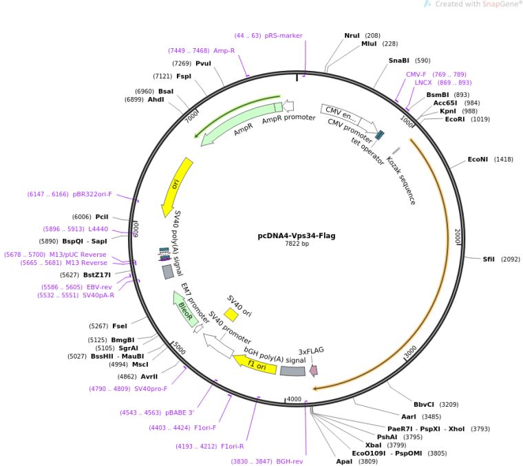 质粒名称:pcDNA4-Vps34-Flag 质粒编号:24398 载体名称:pCDNA4/TO-3*flag 载体大小:5100 载体类型:哺乳动物表达 原核抗性:氨苄青霉素,100μg/mL 培养温度:37℃ 克隆菌株:DH5alpha 高拷贝/低拷贝:高拷贝 插入基因:Vps34 物种来源:H. sapiens (human) 基因名称:PIK3C3 (a.k.a. VPS34, Vps34, hVps34) 克隆方法:限制性内切酶 5'克隆位点:NotI (not destroyed) 3'克隆位点:NotI (not destroyed) 5'测序引物:CMV-F 3'测序引物:BGH-rev 质粒图谱:
