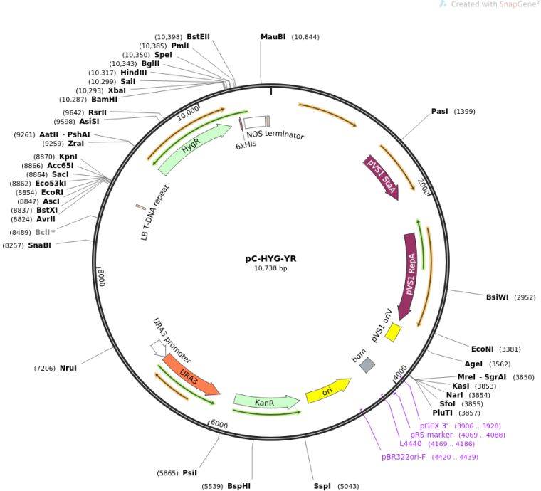 质粒名称:pC-HYG-YR 质粒编号:61765 质粒备注: Yeast recombinational cloning compatible Agrobacterium tumefaciens ternary vector containing hygromycin selectable marker on transfer DNA (TDNA). 载体名称:pCAMBIA-0380 载体大小:6812 完整质粒大小:10737 载体类型:Ternary vector for Agrobacterium mediated transformation of fungi 筛选标记:Hygromycin, URA3 原核抗性:卡那霉素,50μg/mL 培养温度:37℃ 克隆菌株:DH5alpha 高拷贝/低拷贝:高拷贝 插入基因:Hygromycin 物种来源:Synthetic 启动子:trpC promoter 克隆方法:限制性内切酶 5'克隆位点:EcoRI (not destroyed) 3'克隆位点:HindIII (not destroyed) 5'测序引物:LB-F1 (5'-gtggtgtaaacaaattgacgc-3') 3'测序引物:RB-F1 (5'-ggataaaccttttcacgccc-3') 质粒图谱:
