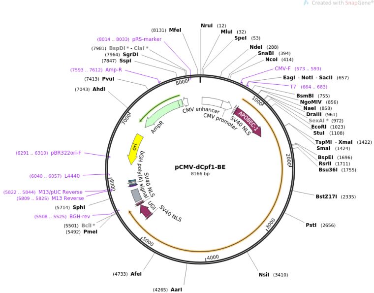 质粒名称:pCMV-dCpf1-BE 质粒编号:107685 质粒备注: Expresses dLbCpf1-BE in mammalian cells 载体名称:CMV 载体类型:哺乳动物表达 原核抗性:氨苄青霉素,100μg/mL 培养温度:37℃ 克隆菌株:DH5alpha 高拷贝/低拷贝:高拷贝 插入基因:dLbCpf1-BE 基因别名:pCMV-SV40NLS-APOBEC1-XTEN-dLbCpf1(D832A/E1006A/D1125A)-SV40NLS-SGGS-UGI-SV40NLS 物种来源:R. norvegicus (rat); Lachnospiraceae bacterium, Bacteriophage PBS2 基因突变:D832A/E925A/D1148A 插入大小:4764 启动子:CMV 克隆方法:Gibson Cloning 5'测序引物:CMV 3'测序引物:BGH poly reverse 质粒图谱: