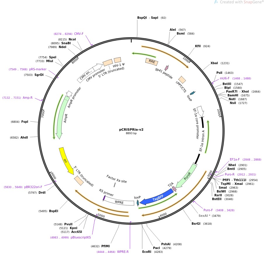 质粒名称:pCRISPRia-v2 质粒编号:84832 质粒备注: CRISPRi/a V2 library parental plasmid 载体名称:pSICO derivative 载体大小:8200 完整质粒大小:8888 载体类型:哺乳动物表达,慢病毒,CRISPR 筛选标记:嘌呤霉素 原核抗性:氨苄青霉素,100μg/mL 培养温度:37℃ 克隆菌株:NEB Stable 高拷贝/低拷贝:高拷贝 插入基因:sgRNA 插入大小:113 启动子:mU6 克隆方法:限制性内切酶 5'克隆位点:BstX1 (not destroyed) 3'克隆位点:Blp1 (not destroyed) 5'测序引物:gcgccaattctgcagacaaa 3'测序引物:CCTTCTCTAGGCACCGGTTC 质粒图谱: