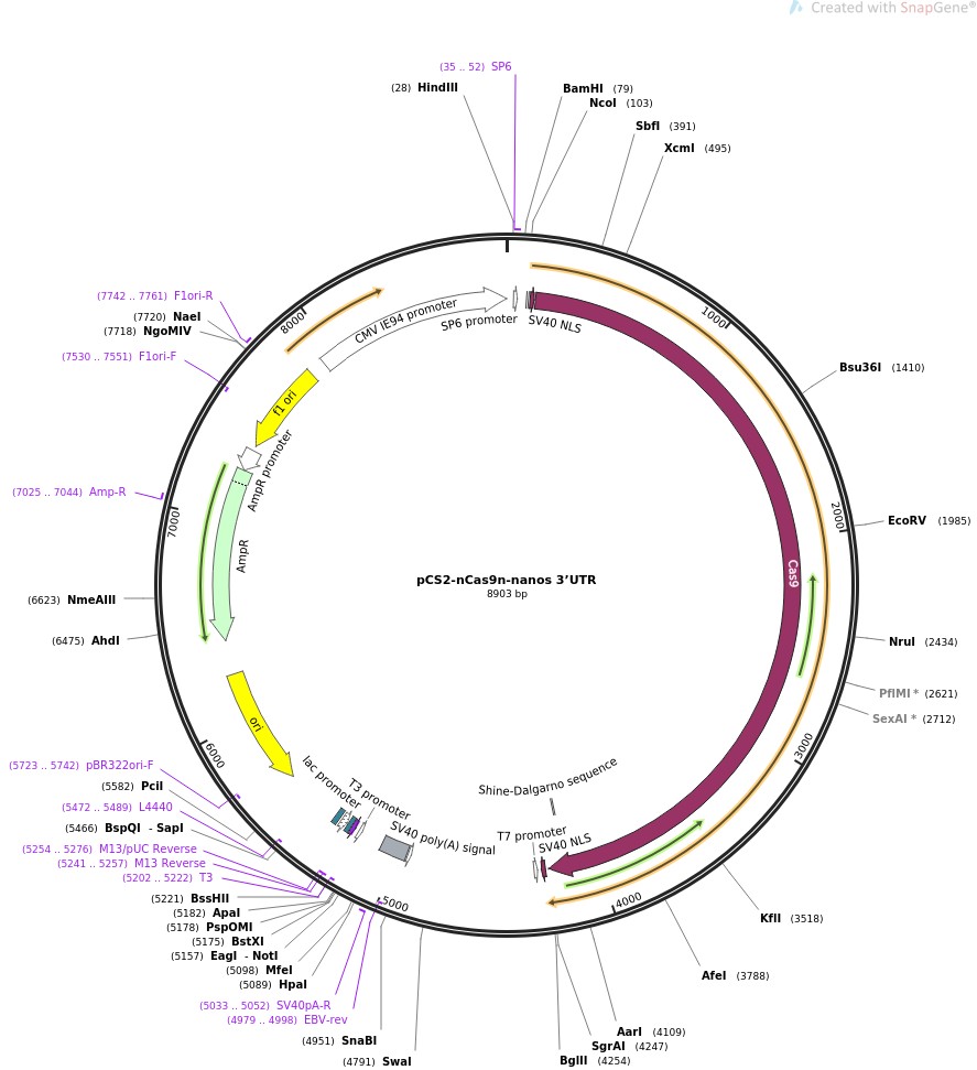 质粒名称:pCS2-nCas9n-nanos 3’UTR 质粒编号:62542 质粒备注: expression of a germ-line targeted, codon optimized Cas9 for genome-editing in zebrafish 载体名称:pCS2-nCas9n 载体大小:8272 完整质粒大小:8910 载体类型:CRISPR 原核抗性:氨苄青霉素,100μg/mL 培养温度:37℃ 克隆菌株:DH5alpha 高拷贝/低拷贝:高拷贝 插入基因:nanos 3' UTR 基因别名:nos1 物种来源:D. rerio (zebrafish) 基因突变:3' UTR only 基因名称:nanos3 (a.k.a. cb725, nanos, nanos1, nos1) 启动子:SP6 克隆方法:限制性内切酶 5'克隆位点:SnaBI (destroyed during cloning) 3'克隆位点:NotI (not destroyed) 5'测序引物:ATCaccggtAGCGGACATTGATGCTCC 3'测序引物:T3 质粒图谱: