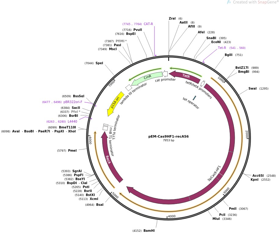 质粒名称:pEM-Cas9HF1-recA56 质粒编号:89962 质粒备注: Modified from pEM-Cas9HF1 (Addgene ID: 89961) to include constitutive recA56 to block recA-mediated double-strand break repair. 载体名称:pEM-Cas9HF1 完整质粒大小:7859 载体类型:原核表达 原核抗性:氯霉素25μg/mL 培养温度:37℃ 克隆菌株:DH5alpha 高拷贝/低拷贝:低拷贝 插入基因:Cas9HF1 物种来源:S. pyogenes 基因突变:N497A/R661A/Q695A/Q926A 启动子:pTet 克隆方法:未知 5'测序引物:taagaaggctggctctgcac 质粒图谱: