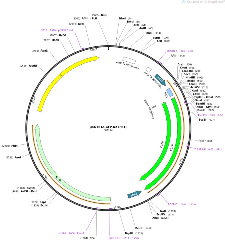 质粒名称:pENTR1A-GFP-N2 (FR1) 质粒编号:19364 质粒备注: Gateway entry vector for C-term eGFP fusion, frame N2 载体名称:pENTR1A 载体大小:2348 载体类型:Gateway Entry vector 原核抗性:卡那霉素,50μg/mL 培养温度:37℃ 克隆菌株:****0F' 高拷贝/低拷贝:高拷贝 插入基因:Enhanced Green Fluorescent Protein 插入大小:719 克隆方法:限制性内切酶 5'克隆位点:Bam HI (not destroyed) 3'克隆位点:Not I (not destroyed) 5'测序引物:ENTRforw 3'测序引物:ENTRrev 质粒图谱: