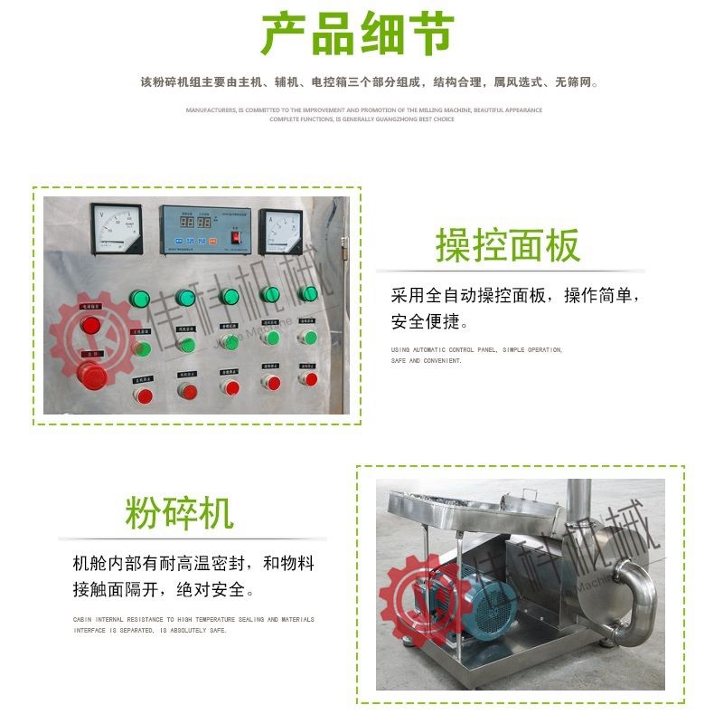 主要用途 香辛料超微粉碎机采用混合喷粉法原理设计研究而成,适用于制药、食品、化工等行业,用途极为广泛。 特点 香料磨粉机结构简单,粉碎室装拆与清洗方便,粉碎室内凡与物料相接触的部分,均采用不锈钢材料制造,能耐酸耐蚀,使被粉碎物料更能符合卫生要求。调味料超微粉碎机具有移动方便,运转平稳、噪音低、粉碎效果好、电耗低等优点。 香辛料超细磨粉机特制了抽风装置,加大了风量,使含油量少的物料能得到更好的粉碎效果。 调味料万能粉碎机特别适合香辛料,纤维物料的粉碎(如:中药材,蘑菇,辣椒,花椒,小茴香,孜然,豆蔻,姜黄等)