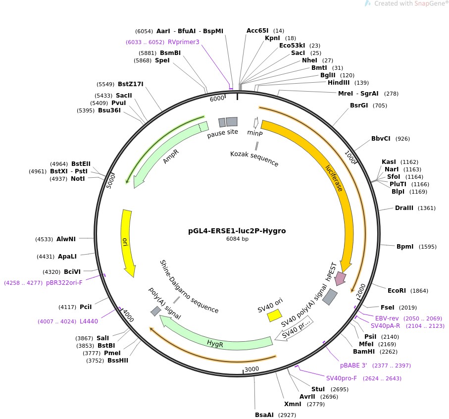 质粒名称:pGL4-ERSE1-luc2P-Hygro 质粒编号:101789 质粒备注: Luferase reporter plasmid containing three tandem repeats of the ER stress response element-I (ERSE-I) 载体名称:pGL4.29 载体类型:Mammalian Expression, Luciferase 筛选标记:潮霉素 原核抗性:氨苄青霉素,100μg/mL 培养温度:37℃ 克隆菌株:DH5alpha 高拷贝/低拷贝:高拷贝 插入基因:3xERSE-I 物种来源:Synthetic 插入大小:93 启动子:minimal TATA-box promoter with low basal activity 克隆方法:限制性内切酶 5'克隆位点:NheI (not destroyed) 3'克隆位点:BglII (not destroyed) 5'测序引物:ctaactggccggtacctgag 3'测序引物:aacagtaccggattgccaag 质粒图谱: