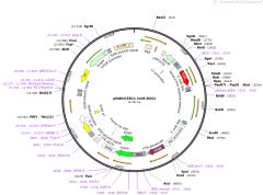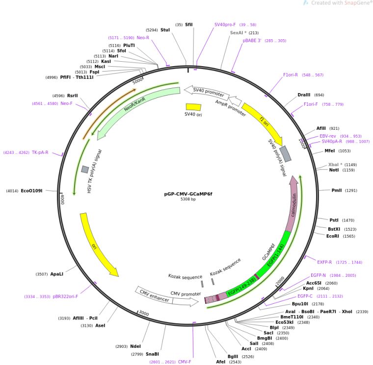 质粒名称:pGP-CMV-GCaMP6f 质粒编号:40755 质粒备注: Mammalian expression of ultrasensitive protein calcium sensor 载体名称:pEGFP-N1 载体大小:3955 完整质粒大小:5308 载体类型:哺乳动物表达 筛选标记:新霉素(G418) 原核抗性:卡那霉素,50μg/mL 培养温度:37℃ 克隆菌株:DH5alpha 高拷贝/低拷贝:高拷贝 插入基因:GCaMP6f 基因别名:GCaMP3-T302L R303P A317E D380Y T381R S383T R392G 基因别名:GCaMP3 variant 693 物种来源:R. norvegicus (rat), G. gallus (chicken); A. victoria (jellyfish) 插入大小:1353 启动子:CMV 标签/融合蛋白:· 6xHis (N terminal on insert) · T7 epitope (N terminal on insert) · Xpress tag (N terminal on insert) 克隆方法:限制性内切酶 5'克隆位点:BglII (not destroyed) 3'克隆位点:NotI (not destroyed) 5'测序引物:CMV Forward 3'测序引物:SV40pA-R 质粒图谱: