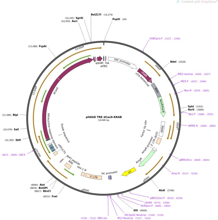 质粒名称:pHAGE TRE dCas9-KRAB 质粒编号:50917 质粒备注: Tet-regulatable dCas9-KRAB 2nd generation lentiviral expression vector 载体名称:pHAGE 完整质粒大小:14649 载体类型:哺乳动物表达,慢病毒,CRISPR 筛选标记:新霉素(G418) 原核抗性:氨苄青霉素,100μg/mL 培养温度:37℃ 克隆菌株:NEB Stable 高拷贝/低拷贝:高拷贝 插入基因:dCas9 物种来源:S. pyogenes 基因突变:D10A, H840A (catalytically inactive) 插入大小:4460 启动子:TRE 标签/融合蛋白:· 3xHA (C terminal on insert) · KRAB (C terminal on insert) 克隆方法:Gateway Cloning 5'测序引物:AGAGCTCGTTTAGTGAACCG 质粒图谱: