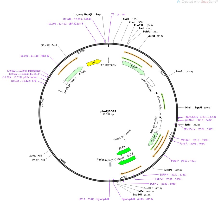 质粒名称:pimEJ5GFP 质粒编号:44026 载体名称:p59 pim targeting vector 载体类型:哺乳动物表达 原核抗性:氨苄青霉素,100μg/mL 培养温度:37℃ 克隆菌株:DH5alpha 高拷贝/低拷贝:未知 插入基因:EJ5GFP egfp-based chromosomal break reporter 物种来源:Synthetic 基因突变:pCAGGS promoter and eGFP separated by pgkPURO cassette flanked by two I-SceI sites 启动子:pCAGGS 克隆方法:未知 5'测序引物:ttcctacagctcctgggcaacg 3'测序引物:ttttggcagagggaaaaaga 质粒图谱: