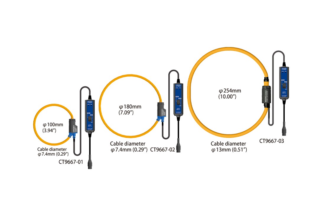 ● 能够在狭窄间隙或者密集排线中使用的纤细型 ● 适用于密集型排线的钳口形状 ● 最大5000A的大电流测量 ● 10Hz~20kHz,宽带宽 ● 可根据用途选择3种不同的可测导体直径 ● 能和钳形功率计/存储记录仪组合使用 基本参数 | CT9667-01 | CT9667-02 | CT9667-03 |