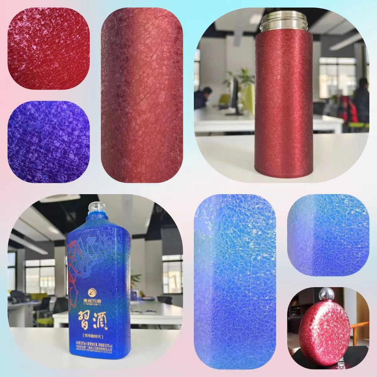 操作指南 1、 使用前请将冰花树脂搅拌均匀; 2、 加15~30%稀释剂进行稀释,稀释剂没有特别的要求; 3、 喷涂膜厚20~30um; 4、 烘烤:温度120~150℃,时间 30~50分钟,温度高烘烤时间则短; 所喷的漆膜厚度不一样,所呈现出来的立体感也不一样,一般喷得越厚立体感越强,反之喷得薄则立体感薄。 彩色的冰花漆,它的颜色是由底色衬托出来的,由色精、色粉决定。与冰花漆无关。