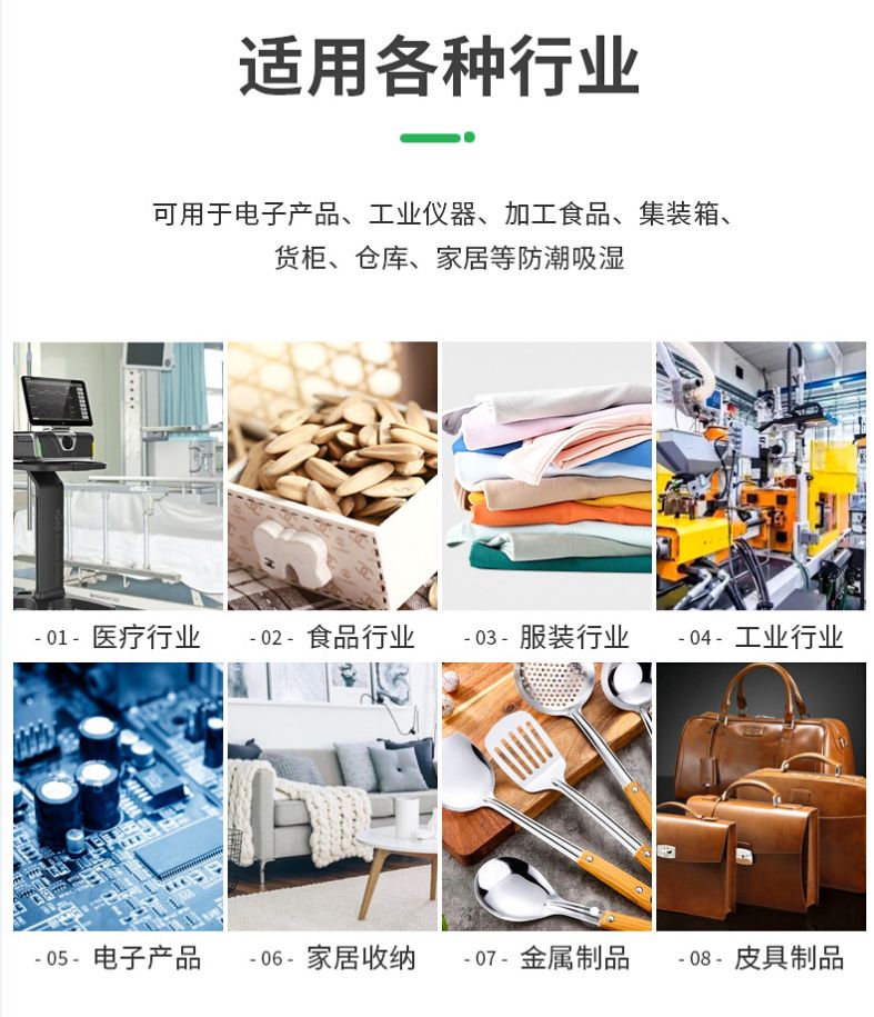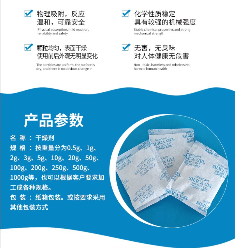 50克干燥剂采用硅胶为原料把硅胶装在透气性小袋中加工而成,可以方便的放置在各种物品的包装中起防潮、防锈、防止霉变和异味的作用。仪器仪表、服装鞋帽、集装箱运输和家庭衣柜及各种物品防潮都可适用。