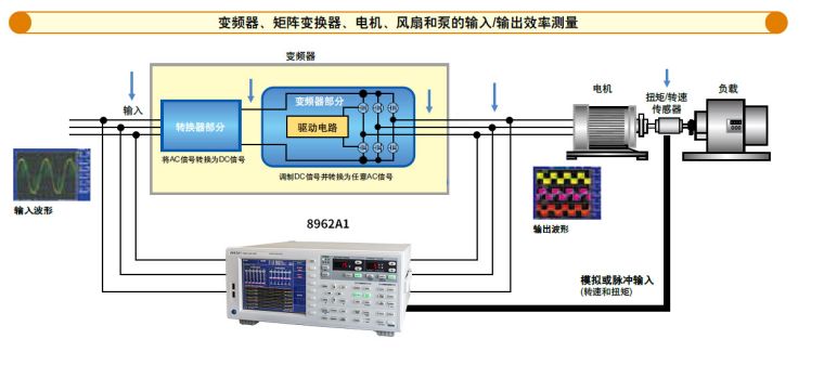 8962A1的优势 1、宽带宽和高速采样 8962A1提供16位的高分辨率和200KHZ采样,确保能以更高的精度测量更快的信号。 2、电机评价 可以通过转速传感器或者扭矩传感器的模拟/脉冲输入来测量电机的转速、扭矩和输出(机械效率)。 3、谐波的测量 可以同时测量失真因数(如THD)、基波和谐波成分。 4、电池充电和放电测量 通过积分测量,可以对电池的充电和放电进行评估。 5、线路滤波器可滤掉高频成分 在变频器波形的功率评价中,测量值会受到高频成分的影响。通过数字滤波器功能,可以去除叠加在信号上的不必要的高频成分。每个输入单元都可以单独设置滤波器,8962A1标配线路滤波器,截止频率为500 Hz-100 kHz。10KHz以内步长100Hz连续可调;10KHz以上步长1KHz连续可调。频率滤波器截止频率为50Hz-10000Hz,步长1Hz连续可调。 技术参数