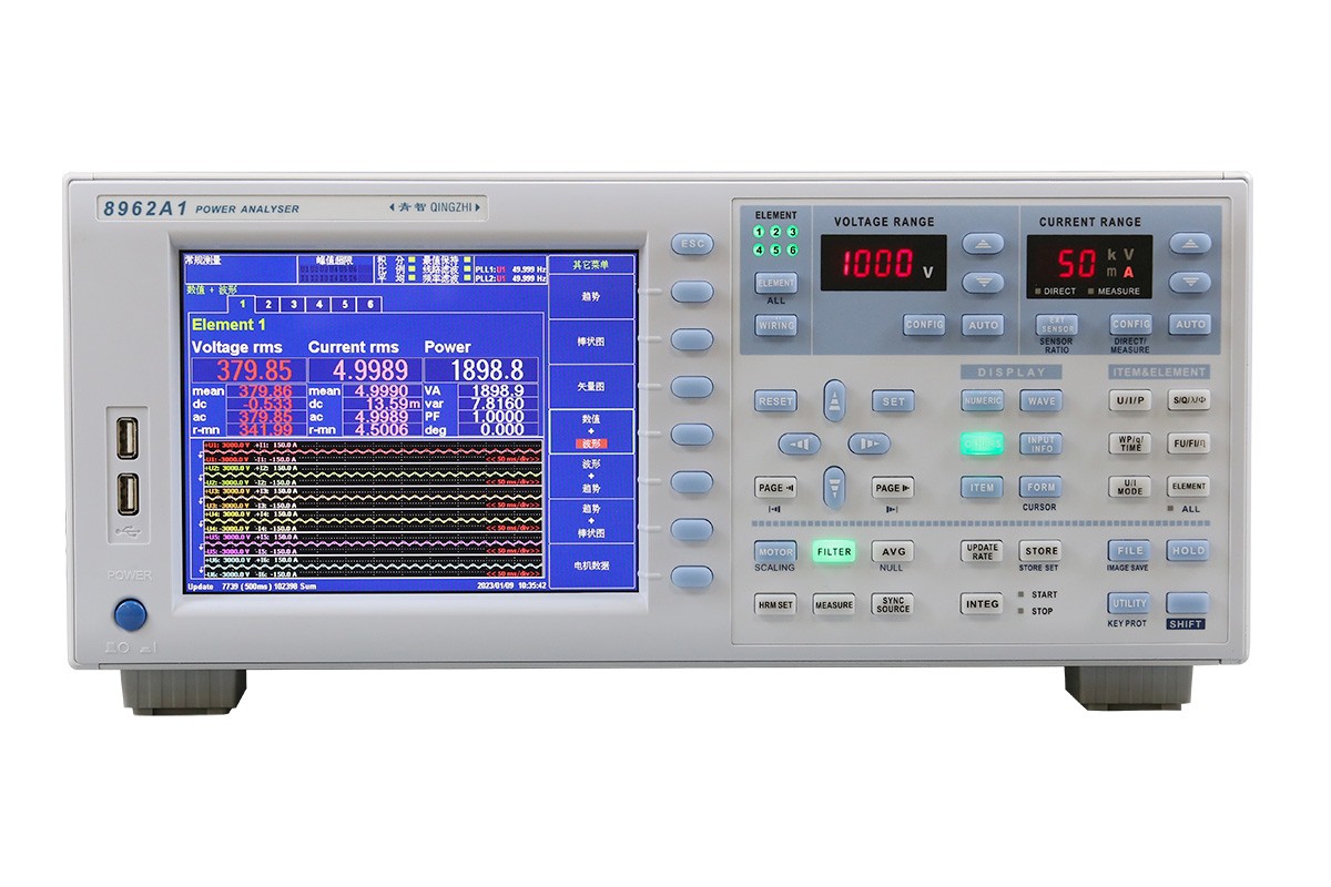 产品特点 •精度-在同类功率分析仪器中,青智的8962A1是带宽范围0.5Hz-300KHz,精度达到0.1级的功率分析仪,它可以执行多达500次谐波分析(工频的基波频率)。 •可靠-测量需要重复执行并需要追求准确性。8962A1稳定性极高,无论现在还是将来,都可以确保完成精准的测量。 •灵活-8962A1不但拥有最多6通道(输入和输出),还可以增加转速扭矩接口(选配),并且可以和电脑相连接,能在功率效率和谐波分析领域为客户提供广泛的测量解决方案。 8962A1功率分析仪的具体应用 电动新能源汽车有许多电子和机械部件,因此,整体性能评价需要对效率进行测量。962A1可以执行6个功率输入的测量,操作灵活且拥有较宽的带宽,是测试和评估变频器输入和输出之间效率理想的工具。通过选配电机评价功能,8962A1可以测量转速和扭矩的变化。