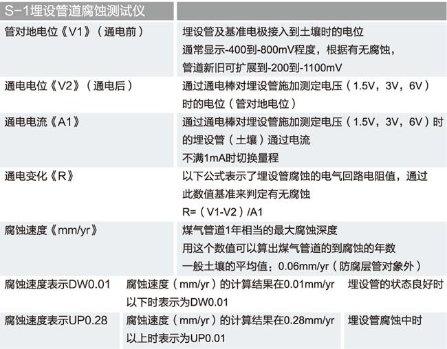 日本三和(sanwa)S-1埋设管道腐蚀测试仪是非挖开即能快速测量埋设管道的腐蚀度,可以说是对埋设管的安全管理很有帮助的常备设备。是在不挖开煤气供给埋设管道的情况下,经由通电棒对发生了电气化学反应的埋设煤气管道通直流电流,通过测定宏电池的电阻=通电变化值(通电变化值越小,通过电流越大,腐蚀度越高)的原理来表示腐蚀的进行度。通电变化值小于10欧姆时,可能已经发生了混凝土 土壤内的宏电池腐蚀,需要尽早解决腐蚀问题。 产品特点 ■ 本机搭载CPU可以数字显示LP煤气等埋设管道的腐蚀状况■ 同时显示(管对地电位)(通电电位)(通电电流)(通电变化值)(腐蚀速度)的基本测定结果。通过输入埋设后的经过年数到计算式里,可以简单算出埋设管的耐用(残存)年数 ■ 可以做出定期诊断,测定记录,报告书 ■ 煤气埋设管的腐蚀速度以年单位来快速表示 ■ 内藏电池,自动省电功能。 ■ 主体轻,便携化设计。 技术参数 ![]() |