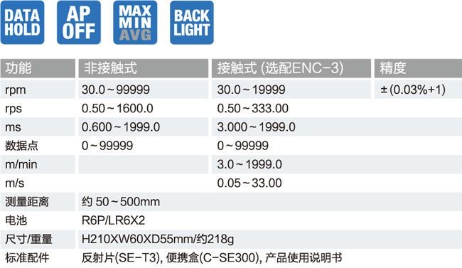日本三和(sanwa)SE300转速计,外壳独特的流线型设计,使用极为方便,是测量马达等旋转体的转动圈数的非接触式和接触式两用型手持转速计。 产品特点 ■ 可单手测量也可双手测量,双手持机更有更有利于稳定的测量数据■ 采用液晶数字显示,数字显示99999字,高亮度背光,直观准确,使用方便,体积小,便于携带,适用范围广 ■ 接触和非接触测量兼顾的两用型 ■ 测量数值稳定且手持方便 ■ 多种测量模式 ■ 非接触式测量感知距离长(约50cm),可以在远离旋转体的位置测量 ■ 数据锁定用于观察和记录测量数据 ■ 最大/最小值保持功能,测量的最大值和最小值将被记录并显示 ■ 自动关机 (2分钟可取消) 延长了电池寿命 ■ 电池消耗警告提示 ■ 除手持使用外,也可用固定的三角架来固定本机使用,以此得到更准确的测试数据 ■ 用接触方式测试时,测量探头须换上接触式圆周线速度测量环(ENC-3选配) ■ 抽样率: 约1次/秒 技术参数 ![]() 选件 反射片(50片X2张):SE-T3接触探头套装(接触探头适配器, 接触探头,接触轮) :ENC-3 接触探头:SE-A30 接触轮:SE-A31 |