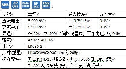 日本三和(sanwa)KP1电压表是业界最高安全规格CAT IV 电压检测表,大屏幕数码液晶显示和背光,即使在光线较弱的位置也能有效读数,增强了可读性。 产品特点 ■ 数字显示9999字■ 交流真有效值,可保证测量数据的准确性 ■ 接触和非接触式电压检测功能,检查电线是否断线并有蜂鸣器提示 ■ 带背光的液晶显示,还具备了LED发光灯 ■ 数据锁定用于观察和记录测量数据 ■ 自动关机功能1分钟,延长了电池寿命 ■ 抽样率 : 6次/秒(ACV), 5次/秒(DCV) ■ 安全规格: IEC61010-1, IEC61010-2-030 CAT.IV600V/CAT.III1000V, IEC61010-2-33, IEC61010-31 技术参数 ![]() |