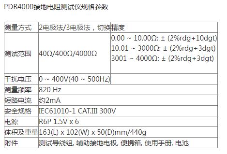 日本三和(sanwa)■ PDR4000接地电阻测试仪,可进行A种到D种接地电阻测量■ 接地电阻的测量方式有2电极法和3电极法两种可选 ■ 自动关机功能便于节省电池消耗 产品特点 ■ 三个测量范围:40Ω,400Ω,4000Ω■ 可进行A种到D种接地电阻测量 ■ 接地电阻的测量方式有2电极法和3电极法两种可选 *可选附件TL-68用于2电极法测量 ■ 背光功能 ■ 数据保持功能 ■ 相对功能 ■ 自动关机功能便于节省电池消耗 ■ 能够测量干扰电压 ■ 短路电流约2mA ■ 设计符合国际安全规格IEC61010-1 CAT.III 300V ■ PDR4000数字式接地电阻测试仪技术参数 技术参数 ![]() |