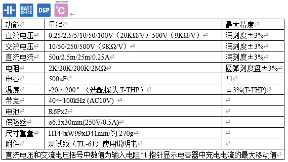 日本三和(sanwa)SP20多功能、多量程的指针式,表头内采用铂金丝,来增加表头可动部的弹性,防止扭曲损伤,增加产品使用寿命. 具有测量交直流电压、直流电流、电阻、电容和温度功能. 产品特点 ■ 多功能、多量程的指针式测量仪表■ 表头内采用铂金丝,来增加表头可动部的弹性,防止扭曲损伤,增加产品使用寿命 ■ 具有测量交直流电压、直流电流、电阻、电容和温度功能 ■ 20个量程可选 ■ 电容测试达500uF ■ 可测试温度-20°~200°(需选配T-THP温度探头) ■ 标配镀金表笔,防腐,防接触不良,提高测量的精度 ■ 频带宽度: 40~100kHz (AC10V) 技术参数 ![]() 选件 选件携带箱:C-SPH 温度测量探头:THP 夹头适配器:CL-14,CL-13a,CL-15a,TL-9IC,TL-A7M2,TL-A4 测试线:TLF-120,TL-ACV |