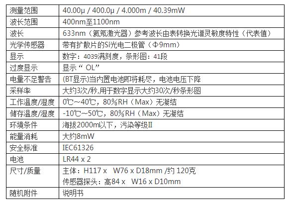 日本(sanwa)LP10激光功率计,小型超薄便携式,外观独特,功耗低,便于携带。 大屏幕液晶显示屏,数字和模拟条双显示,增强了可读性。 产品特点 ■ 小型超薄便携式,外观独特,功耗低,便于携带的激光功率计■ 大屏幕液晶显示屏,数字和模拟条双显示,增强了可读性 ■ 4039计数,条形图显示 ■ 41段快速条形图显示类似于模拟指针适用于快速变化或不稳定信号 ■ 广阔的光电功率检测范围0.1μW〜40.39mW ■ 受光探头带有扩散片Si光电二极管, 用于抑制激光射入到光接收表面时产生的返回光 ■ 受光探头延长线500mm ■ 受光探头可以放置在本机盒内,以保护受光探头 ■ 射束光检测中便利的最小值/最大值保持功能 ■ 利用盒盖标注的系数换算表,可以读取400n~1100nm波长数据 ■ 自动关机(上次操作后15分钟)便于节约电池电量 ■ 使用激光的设备的光功率水平 ■ 633nm He-Ne激光器和红色半导体激光器(例如用于DVD播放器,条形码阅读器等)。 ■ 532nm绿色激光,488nm氩离子激光,405nm紫蓝激光 ■ 在波长指定范围400n~1100nm内,可为特殊波长直接校准固定波长 ■ 本机标准型号LP10(固定波长:633nm) 技术参数 ![]() |